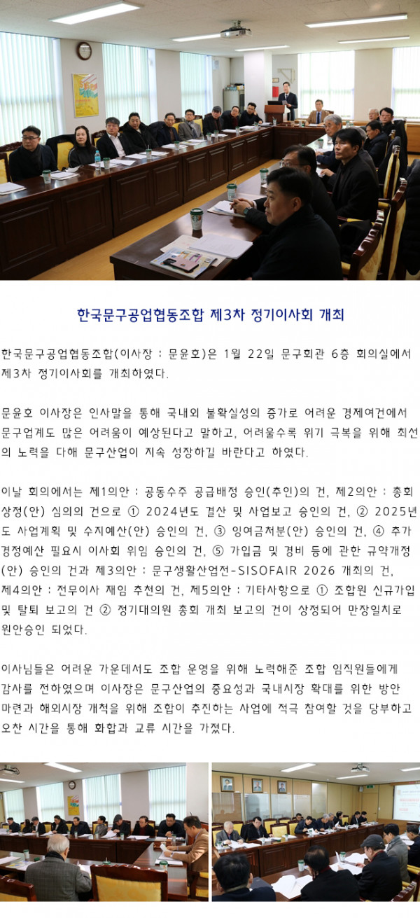 한국문구공업협동조합 제3차 정기이사회 개최 페이지 정보 작성자 한국문구공업협동조합 댓글 0건 조회 311회 작성일 25-01-22 14:30 목록 본문 목록 이전글 독일 Ambiente 2025 소비재전 한국관 파견 25.02.18 다음글 2024 신규가입 조합원 초청 간담회 개최 24.12.05
